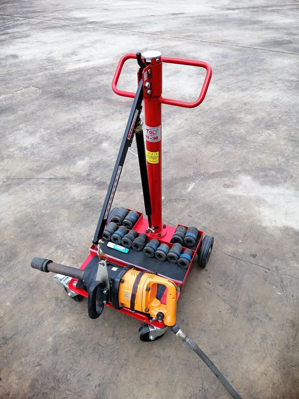 Hiện nay súng xiết bulong chế tạo có trọng lượng ngày càng tăng lên, do vậy rất cần đến giá đỡ súng hỗ trợ cho thợ làm lốp, xe nâng súng được thiết kế 4 bánh xe linh động, xích tăng đưa linh hoạt dể dàng làm giảm lực cho người sử dụng, giảm thiểu mệt mỏi tối đa cho những người thợ trong quá trình sửa chữa lốp.