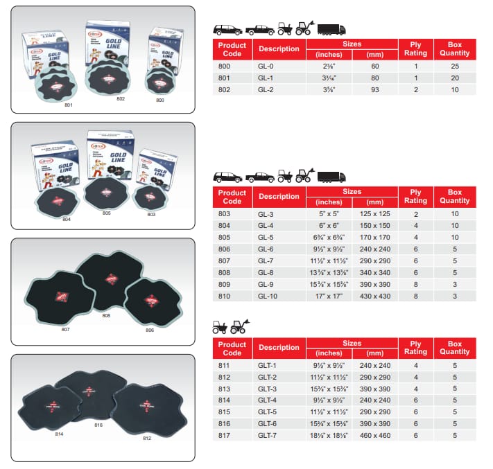 - Để chọn miếng vá phù hợp với vết thủng và loại lốp khách hàng có thể tra trên bảng thông số dưới đây.